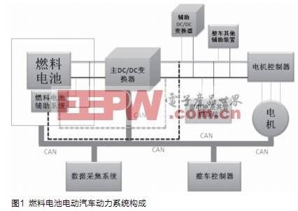 目前,燃料電池電動汽車(FCEV)成為我國汽車科技創(chuàng)新主攻方向。燃料電池電動汽車動力系統(tǒng)主要由燃料電池發(fā)動機(jī),DC/DC變換器,蓄電池,電機(jī)控制器(變頻器)及電機(jī),整車控制器,數(shù)據(jù)采集系統(tǒng)及CAN總線組成,如圖1所示。其中DC/DC變換器可以對燃料電池的輸出進(jìn)行控制及能量的傳遞與轉(zhuǎn)換,成為燃料電池電動汽車關(guān)鍵零部件之一。在燃料電池電動汽車運(yùn)行過程中,DC/DC變換器所處的電磁環(huán)境十分復(fù)雜,各種形式的電磁干擾很多,嚴(yán)重影響了DC/DC變換器的正常運(yùn)行。因此,研究FCEV用DC/DC變換器的電磁兼容性對DC/DC變換器乃至燃料電池電動汽車的可靠運(yùn)行具有重要意義。