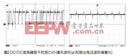 FCEV用DC/DC變換器的功率一般比較大,通常選擇IGBT為功率開關(guān)管。功率開關(guān)管IGBT工作過程中產(chǎn)生高的du/dt和di/dt以及浪涌電流和尖峰電壓[1],這是FCEV用大功率DC/DC變換器產(chǎn)生電磁干擾最根本的原因。另外功率開關(guān)管開通和關(guān)斷瞬間,由于分布電感和分布電容的存在,電感電流容易發(fā)生高頻振蕩,這些因素都會產(chǎn)生強(qiáng)大的電磁干擾,這在FCEV用大功率DC/DC變換器中表現(xiàn)的尤為明顯。這種電磁干擾嚴(yán)重影響整車控制器與CAN通信,導(dǎo)致CAN通訊頻繁報錯,無法正常通訊。CAN通訊受干擾后的傳輸波形如圖2(a)所示。從圖中可以明顯看到,變換器開關(guān)噪音疊加在CAN通訊脈沖上,并且幅度很大。此外,嚴(yán)重的電磁干擾也會使大功率DC/DC變換器輸出紋波過大,紋波過大直接影響大功率DC/DC變換器的性能[2]。圖2(b)是用示波器采集到的變換器未經(jīng)濾波處理的輸出電壓波形,從圖中可以看到,輸出電壓上疊加了大量的開關(guān)噪音。