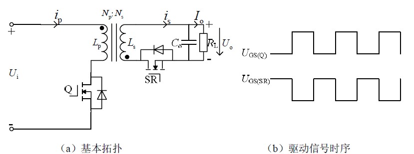 反激變換器次級的整流二極管用同步整流管SR 代替,構(gòu)成同步整流反激變換器,基本拓?fù)淙鐖D1(a)所示。為實現(xiàn)反激變換器的同步整流,初級MOS 管Q 和次級同步整流管SR 必須按順序工作,即兩管的導(dǎo)通時間不能重疊。當(dāng)初級MOS 管Q 導(dǎo)通時,SR 關(guān)斷,變壓器存儲能量;當(dāng)初級MOS 管Q 關(guān)斷時,SR 導(dǎo)通,變壓器將存儲的能量傳送到負(fù)載。驅(qū)動信號時序如圖1(b)所示。在實際電路中,為了避免初級MOS 管Q 和次級同步整流管SR 同時導(dǎo)通,Q 的關(guān)斷時刻和SR 導(dǎo)通時刻之間應(yīng)有延遲;同樣Q 的導(dǎo)通時刻和SR 的關(guān)斷時刻之間也應(yīng)該有延遲。