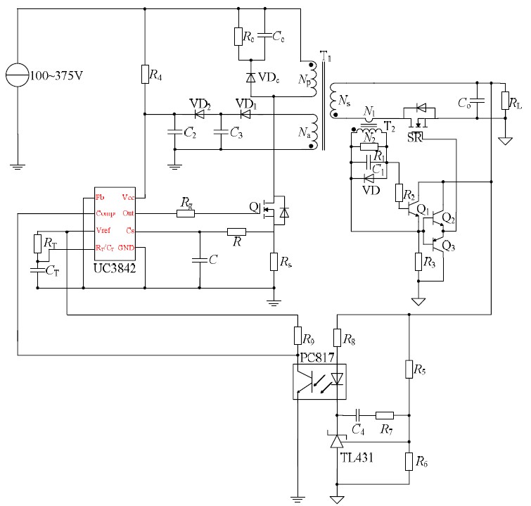 反激變換器應(yīng)用廣泛,采用同步整流技術(shù)能夠很好的提高反激變換器效率,同時為使同步整流管的驅(qū)動電路簡單,采用分立元件構(gòu)成驅(qū)動電路。本文詳細(xì)分析了同步整流反激變換器的工作原理和該驅(qū)動電路的工作原理,并在此基礎(chǔ)上設(shè)計了100V~375VDC 輸入,12V/4A 輸出的同步整流反激變換器,工作于電流斷續(xù)模式,控制芯片選用UC3842,對設(shè)計過程進(jìn)行了詳細(xì)論述。通過Saber 仿真驗證了原理分析的正確性,證明該變換器具有較高的變換效率。
