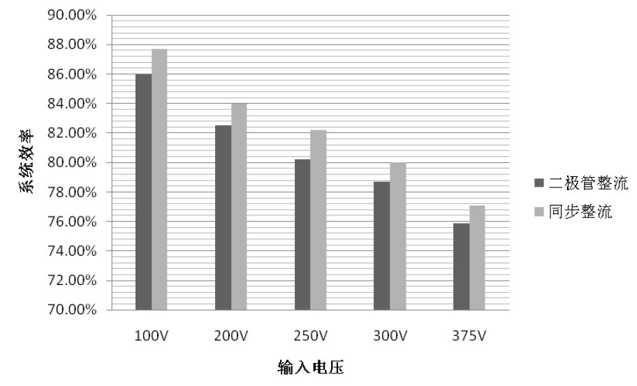 應(yīng)用 Saber 仿真軟件對本文設(shè)計的同步整流反激變換器進(jìn)行仿真。圖4 為輸入電壓200V,滿載時,初級MOS 管Q、次級同步整流管SR 驅(qū)動信號和次級電感電流波形。由圖可見,Q 關(guān)斷后,SR 經(jīng)過很短的延遲后就開通,次級電感電流降至接近零時,SR 關(guān)斷。圖5 為輸入電壓100V、200V、250V、300V 和375V,滿載條件下,分別采用同步整流和二極管整流時,系統(tǒng)效率的分布圖。