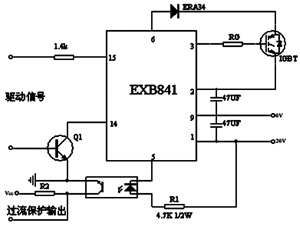 隨著IGBT在各類變流裝置中的廣泛應(yīng)用,IGBT驅(qū)動模塊的選擇及其性能越來越引起使用者的重視。理想的驅(qū)動模塊除了應(yīng)為IGBT提供足夠的開通和關(guān)斷柵壓外,還應(yīng)具備迅速、可靠的保護(hù)功能,同時力求電路簡單、穩(wěn)定。IGBT的常用驅(qū)動模塊有許多種,其中EXB系列應(yīng)用最廣。EXB841驅(qū)動模塊廣泛應(yīng)用于開關(guān)電源、UPS、電力傳動及電力補償?shù)阮I(lǐng)域。圖4所示是本設(shè)的IGBT的驅(qū)動電路圖。
