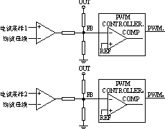 通過檢測RC網(wǎng)絡(luò)中C兩端的電壓,作為電流信號,幾路電流信號(本例只有兩路)通過一個相同的電阻就得到了平均值均流母線,平均值均流母線電壓值與負(fù)載有關(guān),表征負(fù)載電流的大小。然后將每路采樣來的電流信號與母線電壓比較,得到誤差信號,去修正輸出電壓參考信號,從而對PWM控制器的占空比輸出進(jìn)行微調(diào),達(dá)到均流和穩(wěn)壓的目的。