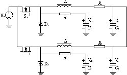 式中:Vc1、Vc2分別為C1和C2上電壓的平均值;IL1、IL2分別是L-和L2流過電流的平均值,亦即兩路輸出電流平均值;R1及R2是濾波電感的等效串聯(lián)電阻,當(dāng)在工藝上設(shè)計并聯(lián)電源每路輸出電感基本上一樣時,可以認(rèn)為R1=R2。因此,要控制兩路電流均流,即要求IL1=IL2,于是,只要控制Vc1=Vc2就行了。所以,電容C1及C2上的電壓Vc1和Vc2可以代表兩路電流IL1及IL2大小,可用來進(jìn)行均流控制。