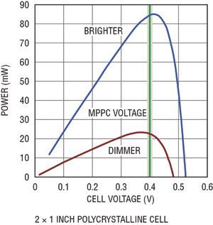 為了從光伏電池抽取最大功率,電源轉換器的輸入阻抗必須與電池的輸出阻抗匹配,從而使系統(tǒng)能在最大功率點上工作。圖3顯示了一個典型的單節(jié)光伏電池的功率曲線。為了確保抽取最大功率,光伏電池的輸出電壓應該與功率曲線的峰值點相對應。LTC3105 調(diào)節(jié)提供給負載的輸出電流,以保持光伏電池的電壓等于最大功率點控制引腳設定的電壓。因此可用單個電阻器設定最大功率點,并確保從光伏電池抽取最大功率和峰值輸出充電電流。