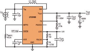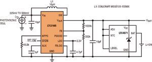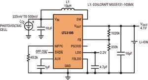 串聯(lián)連接的高壓光伏電池組能提供充足的功率,但單節(jié)光伏電池解決方案卻很少見,因為單節(jié)光伏電池在有負載情況下產(chǎn)生的電壓很低,從這么低的電壓難以產(chǎn)生有用的電源軌。幾乎沒有升壓型轉換器能從電壓很低、阻抗相對較高的單節(jié)光伏電池產(chǎn)生輸出。不過,LTC3105是專門為應對這類挑戰(zhàn)而設計。該器件具有超低的250mV啟動電壓和可編程最大功率點控制,能從富有挑戰(zhàn)性的光伏電源產(chǎn)生大多數(shù)應用所需的典型電壓軌(1.8~5V)。