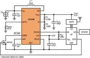 LTC3105是一款完整的單芯片解決方案,適用于從低成本、單節(jié)光伏電池收集能量。其集成的最大功率點控制和低壓啟動功能允許直接用單節(jié)光伏電池工作,并確保最佳能量抽取。LTC3105可用來直接給電路供電,或給能量存儲器件充電,以允許在黑暗或光照很少時工作。LTC3105使其有可能實現(xiàn)自主遠程傳感器節(jié)點、數(shù)據(jù)收集系統(tǒng),以及其他要求不依賴電網(wǎng)和最低限度維護的應用。