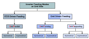 在ECS驅(qū)動饋電時,ECS決定了向電網(wǎng)傳輸?shù)墓β?。如今,單臺RESs逆變器典型地就在這種饋電方式下運(yùn)行,并向電網(wǎng)注入全部可提供的功率。在電網(wǎng)驅(qū)動饋電時,不再是ECS,而是電網(wǎng)決定功率的傳輸。典型的,大多數(shù)常規(guī)大型電廠運(yùn)行在這種方式下,同樣,這種方式潛在的適合DERs和RESs系統(tǒng),或者至少適合混合式電力系統(tǒng)。在ECS驅(qū)動饋電的情況下,逆變器控制方式被稱作電網(wǎng)平行方式。第二種情況可以被兩種不同的逆變器控制方式實(shí)現(xiàn),分別是電網(wǎng)形成方式和電網(wǎng)支持方式。電網(wǎng)形成方式中逆變器的作用是建立和維持電網(wǎng)狀態(tài)變量。電網(wǎng)支持方式中逆變器被用于平衡功率。它可以傳輸預(yù)先設(shè)定數(shù)量的功率,這個數(shù)量可以根據(jù)電力系統(tǒng)的需要或者高級控制運(yùn)行得到的參考值進(jìn)行調(diào)整。應(yīng)用這個控制方式的逆變器例子如圖3至圖5的左側(cè)所示。此外,這些基本有功功率調(diào)控器潛在的對二次電網(wǎng)控制的相互聯(lián)系可以被類似的闡釋。