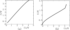 根據(jù)所設(shè)計(jì)的檢測(cè)電路進(jìn)行實(shí)驗(yàn),實(shí)驗(yàn)時(shí),調(diào)節(jié)輸入電壓Ui的大小,并檢測(cè)與之對(duì)應(yīng)的輸出電壓UO的大小,實(shí)驗(yàn)結(jié)果如表1(a)所示。為了進(jìn)行對(duì)比,同時(shí)測(cè)出沒有反饋的光耦的輸入與輸出電壓關(guān)系,并列在表1(b)。根據(jù)表1中(a)、(b)的數(shù)據(jù)分別繪出檢測(cè)電路與單個(gè)光耦的傳輸特性,分別如圖3(a)、(b)所示。