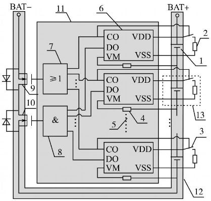 采用單節(jié)鋰電池保護(hù)芯片設(shè)計(jì)的具備均衡充電能力的鋰電池組保護(hù)板示意圖如圖1所示。其中:1為單節(jié)鋰離子電池;2為充電過(guò)電壓分流放電支路電阻;3為分流放電支路控制用開(kāi)關(guān)器件;4為過(guò)流檢測(cè)保護(hù)電阻;5為省略的鋰電池保護(hù)芯片及電路連接部分;6為單節(jié)鋰電池保護(hù)芯片(一般包括充電控制引腳CO,放電控制引腳DO,放電過(guò)電流及短路檢測(cè)引腳VM,電池正端VDD,電池負(fù)端VSS等);7為充電過(guò)電壓保護(hù)信號(hào)經(jīng)光耦隔離后形成并聯(lián)關(guān)系驅(qū)動(dòng)主電路中充電控制用MOS管柵極;8為放電欠電壓、過(guò)流、短路保護(hù)信號(hào)經(jīng)光耦隔離后形成串聯(lián)關(guān)系驅(qū)動(dòng)主電路中放電控制用MOS管柵極;9為充電控制開(kāi)關(guān)器件;10為放電控制開(kāi)關(guān)器件;11為控制電路;12為主電路;13為分流放電支路。單節(jié)鋰電池保護(hù)芯片數(shù)目依據(jù)鋰電池組電池?cái)?shù)目確定,串聯(lián)使用,分別對(duì)所對(duì)應(yīng)單節(jié)鋰電池的充放電、過(guò)流、短路狀態(tài)進(jìn)行保護(hù)。該系統(tǒng)在充電保護(hù)的同時(shí),通過(guò)保護(hù)芯片控制分流放電支路開(kāi)關(guān)器件的通斷實(shí)現(xiàn)均衡充電,該方案有別于傳統(tǒng)的在充電器端實(shí)現(xiàn)均衡充電的做法,降低了鋰電池組充電器設(shè)計(jì)應(yīng)用的成本。