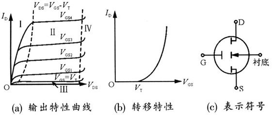 圖2 N溝道增強型絕緣柵場效應(yīng)管的特性曲線和表示符號[page]