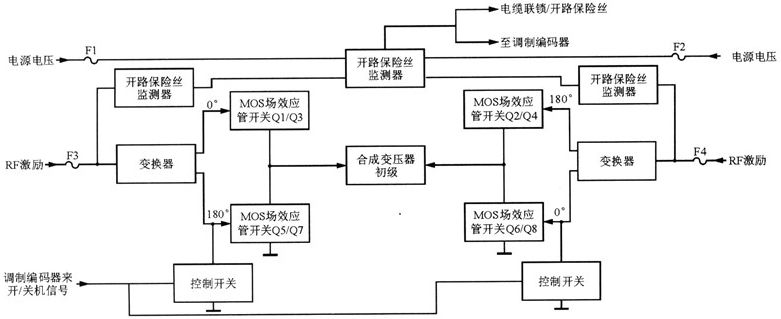 在射頻功放模塊的設(shè)計中,兩個半橋式組態(tài)采用單獨的電源和射頻激勵輸入,這樣可以使每個放大器兩個半橋獨立地進行工作。如將Q1/Q3源極和QS/Q7的漏極接在一起,射頻輸出從0V到+V,則可保證當(dāng)一個全橋組態(tài)的射頻功放模塊在任何一個半橋出現(xiàn)故障時,射頻功放模塊仍然可以工作。只是射頻輸出電壓減小為全橋組態(tài)的一半而已。