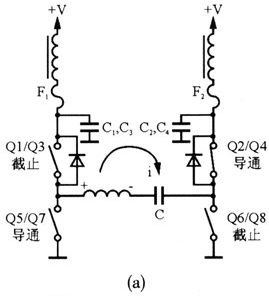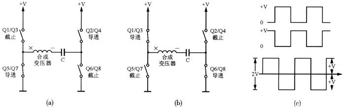 在射頻周期的負半周,Ql/Q3和Q6/Q8處于截止?fàn)顟B(tài),相當(dāng)于開關(guān)斷開;Q2/Q4和QS/Q7則是飽和導(dǎo)通的,相當(dāng)于開關(guān)接通。Q2/Q4和QS/Q7串聯(lián)導(dǎo)通電源電壓為+V,若忽略MOS管的飽和壓降,+V將全部降落在合成變壓器上。在射頻周期的正半周,Q1/Q3和Q6/Q8處于導(dǎo)通狀態(tài),Q2/Q4和QS/Q7為截止?fàn)顟B(tài)。Ql/Q3和Q6/Q8串聯(lián)導(dǎo)通電源電壓+V,+V全部降落在合成變壓器上。由圖4可見,合成變壓器初級電壓方波輸出相差180°,說明輸出電壓的峰峰值為+2V。MOS開關(guān)的作用就是有效地將整個電源電壓跨接在合成變壓器的初級繞組上,在射頻激勵信號的每半個周期是反相的。作為全橋組態(tài),輸出就是兩倍電源電壓的射頻輸出。為了防止直流電壓通過變壓器的繞組通地,應(yīng)在每部分的射頻輸出都串聯(lián)有隔直電容C。