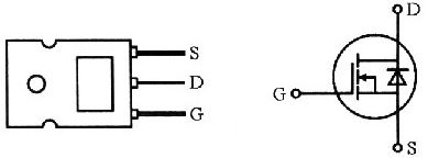 圖7所示為IRFP360的外型及表示符號。它的特點,一是具有隔離式的中心裝配孔,并有重復(fù)性的雪崩定額;二是漏源之間并聯(lián)有反向二極管,其電壓變化率定額很大而且驅(qū)動電路比較簡單,此外,同型號的管子并聯(lián)也很容易。然而,由于MOS管的柵極輸人阻抗較高,容易產(chǎn)生較高的感應(yīng)電壓,從而導(dǎo)致柵極易擊穿,所以在維護中應(yīng)特別注意。