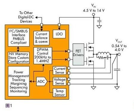 一個應(yīng)用建議是把DC-DC轉(zhuǎn)換器盡可能靠近負(fù)載放置。這樣做可以把EMI降至最低、減小寬的大電流線跡所占用的板空間,并改進(jìn)轉(zhuǎn)換器的動態(tài)特性。“分布式”功率管理系統(tǒng)應(yīng)運而生,在這種系統(tǒng)中,所有轉(zhuǎn)換器都理想地彼此相連。能夠與其它轉(zhuǎn)換器在網(wǎng)絡(luò)中協(xié)同工作的一個控制器例子是FD2004,如圖1的模塊示意圖所示。
