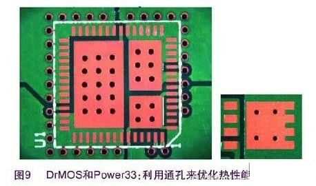 至于版圖布局,金屬較多顯然很有助益。更厚的頂層有助于降低溫度,不過也許對PCB的其余部分并不適合,因為成本增加了,其它元件需要的更精細(xì)的間距也不可能實現(xiàn)。更大的銅面積很有用,但又會消耗PCB空間。這些應(yīng)該盡可能由焊料覆蓋,因為金屬表面比涂漆表面的散熱性更好。在多層PCB中,有時利用內(nèi)層來協(xié)助散熱。熱通孔(填充焊料)有時可用來把熱量擴散到PCB的另一面去(圖9)。