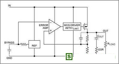 RF電路分為接收和發(fā)送兩部分,供電電壓典型值為2.6V至3.0V,其中低噪聲放大器(LNA)、混頻器、鎖相環(huán)(PLL)、壓控振蕩器(VCO)和中頻(IF)電路需要低噪聲、高PSRR的LDO。實際應用中,VCO、PLL電路的性能直接影響射頻電路指標,如發(fā)射頻譜的純度、接收器的選擇性、模擬收發(fā)器的噪聲、數(shù)字電路的相位誤差等。噪聲會改變振蕩器的相頻和幅頻特性,同時振蕩器環(huán)路也會進一步放大噪聲,可能對載波產生調制。LDO輸出噪聲受其內部設計和外部旁路、補償電路的影響。如圖是線性穩(wěn)壓器的簡單框圖。導致LDO輸出噪聲的主要來源是基準
