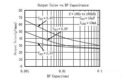[page]為降低基準噪聲,用于連接基準旁路電容。增大旁路電容能夠使基準噪聲成為產生LDO輸出噪聲的次要因素,有利于減小輸出噪聲。建議使用陶瓷電容的典型值為 470 pF 到 0.01 µF 。也可使用此范圍以外的電容,但會對輸入電源上電時LDO 輸出電壓上升的速度產生影響,旁路電容值越大,輸出電壓上升速率越慢。在使用時這點要注意。