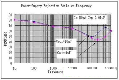 如圖為輸出電容對PSRR的影響。大電容器一般在一定頻率范圍內會提高電源抑制比(PSRR)