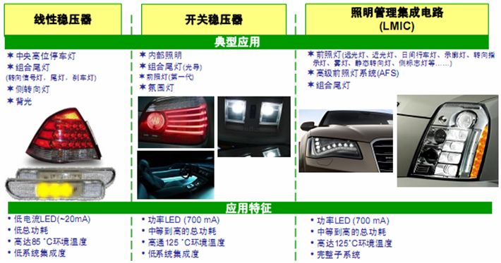 隨著LED性能不斷提升及成本不斷下降,在汽車內(nèi)部及外部照明中的應(yīng)用領(lǐng)域越來越寬。不同應(yīng)用對LED電流的要求又各不相同,故需要結(jié)合具體應(yīng)用要求,選擇適合的LED驅(qū)動器方案,如線性恒流穩(wěn)流器、線性穩(wěn)壓器或開關(guān)穩(wěn)壓器等。本文介紹幾種應(yīng)用比較廣泛的LED驅(qū)動器及具體方案,供設(shè)計人員在進(jìn)行汽車照明設(shè)計時參考。