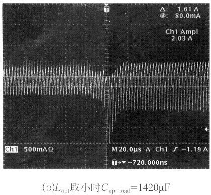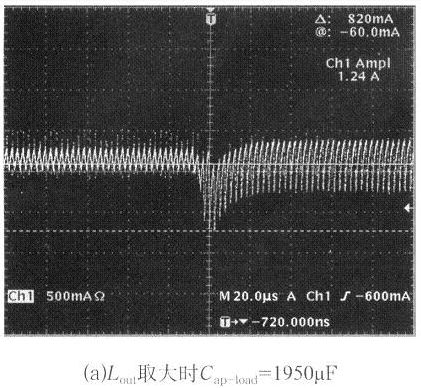 輸出電壓的穩(wěn)定過程中,一方面由輸出濾波電感的儲能來逐步補(bǔ)充,另一方面由反饋環(huán)控制電路原邊快速輸出更大功率。輸出電感的取值一般由電流紋波系數(shù)λ和電源的空載特性來確定,為了避免容性跳變輸出電壓過大的下沖,使控制電路達(dá)到極限,電感的取值要大于λ的理論值計(jì)算所得數(shù)值,但同時(shí)也要考慮輸出失載時(shí)的電壓上沖幅度,所以輸出電感也不能太大,大的電感一般不易制作、成本較高,所以電感的實(shí)際取值可以用實(shí)驗(yàn)的方法得到。圖4給出了輸出電感Lout不同取值時(shí),容性負(fù)載突變時(shí)輸出電感電流的跳變波形和最大的容性負(fù)載能力。