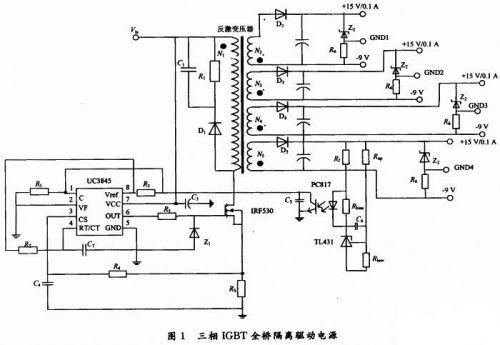 本文設(shè)計(jì)制作了基于電流型PWM控制器UC3845的三相IGBT全橋隔離驅(qū)動(dòng)電源,采用單端反激式結(jié)構(gòu),結(jié)構(gòu)簡(jiǎn)單,成本較低。實(shí)驗(yàn)表明,該隔離驅(qū)動(dòng)電源的輸出電壓穩(wěn)定,負(fù)載調(diào)整率高,具有很高的應(yīng)用價(jià)值,同時(shí)填補(bǔ)了當(dāng)前市場(chǎng)沒(méi)有三相IGBT全橋隔離驅(qū)動(dòng)電源的空白。