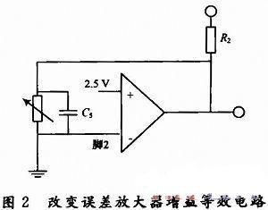 變壓器+15 V,-9 v/0.2 A一路輸出電壓通過(guò)TL431a和光耦PC817反饋到UC3845的1腳,UC3845的2腳接地,UC3845內(nèi)部誤差比較放大器的輸入誤差總是固定的,將PC817的光電晶體管視為可變電阻,1腳的反饋信號(hào)改變的是誤差比較放大器的增益,其等效電路如圖2所示。