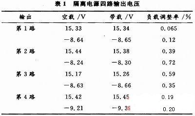 對(duì)設(shè)計(jì)的電路進(jìn)行實(shí)驗(yàn),得出了實(shí)驗(yàn)數(shù)據(jù)和波形。表1為隔離電源在空載和帶載(+15 V,-9 V/0.2 A一路輸出帶載240 Ω,另外3路輸出各帶載120 Ω)下的4路輸出電壓值及相應(yīng)的負(fù)載調(diào)整率。