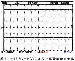 圖3為+15 V,-9 V/0.2 A一路輸出帶載時(shí)的電壓波形。圖3為+15 V,-9 V/0.2 A一路帶載輸出電壓:深色CH1為+15 V輸出,淺色CH2為-9 V輸出。