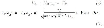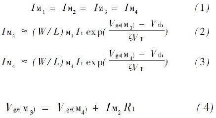式中: K = (W/ L ) M4 / ( W/ L ) M3 ,通過式(5) 可以發(fā)現(xiàn),偏置電流I M1 , I M2與輸入電源無關。