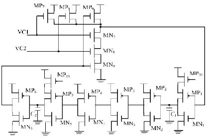本文所設計的主振蕩器采用如圖2 所示的環(huán)形振蕩器結構。VC1, VC2 分別為過壓保護電路, PWM 比較器的輸出信號, MP10和MP11 為帶隙基準提供的鏡像電流, 合理的控制鏡像電流和電容C1 , C2 的大小, 即能夠使主振蕩器在1. 9~ 8 V 的V DD區(qū)間輸出350 kHz 左右較穩(wěn)定的振蕩頻率。