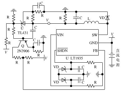 本文設(shè)計的非隔離負(fù)電壓DC/DC開關(guān)電源如圖4所示,負(fù)電源工作在連續(xù)電流模式。當(dāng)電源控制器LT1935內(nèi)部的功率三極管導(dǎo)通時,直流電源給輸出電感L1和輸出電容C1充電。當(dāng)電源控制器LT1935內(nèi)部的功率三極管關(guān)斷時,輸出電感L1中的電流改由通過肖特基二極管VD1提供的低阻抗回路繼續(xù)給輸出電容C1充電直至下一個周期電源控制器LT1935內(nèi)部的功率三極管再次導(dǎo)通??梢婋娙軨1在輸出電感L1儲存能量和釋放能量的過程中均獲得充電,從而減小了輸出紋波電壓。同時,在CCM條件下,輸出電流在LT1935內(nèi)部功率三極管的導(dǎo)通和關(guān)斷期間均通過輸出電感L1,這很大程度上抑制了輸出電流的波動,降低了輸出紋波電流的影響,進(jìn)而大大增加系統(tǒng)的帶負(fù)載能力和效率。