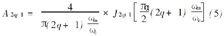 式中, q= 0, 1, 2, ……∝;ω m 是調(diào)制頻率; ωc 是載波頻率; ωm ≤ωc , a是調(diào)制指數(shù); J v ( z) 是第一類(lèi)Bessel 函數(shù)。公式( 5) 只適用于頻率范圍遠(yuǎn)遠(yuǎn)低于載波頻率, 此時(shí)在一次波段的載波頻率可以忽略不計(jì)。在本文的系統(tǒng)研究中, m / c= 1/ 90 適用于規(guī)定計(jì)算, 并假設(shè)調(diào)制指數(shù):