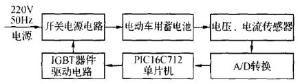 目前,電動(dòng)車電池作為一種儲(chǔ)能裝置,主要以鉛酸蓄電池為主,充電器是專門(mén)針對(duì)鉛酸蓄電池所設(shè)計(jì)的。傳統(tǒng)的蓄電池充電器采用電流/電壓負(fù)反饋的方法來(lái)達(dá)到恒流/恒壓充電的目的,為了實(shí)現(xiàn)充電過(guò)程各種工作參量的實(shí)時(shí)監(jiān)測(cè)及智能多段式充電策略的精確控制,引入電流/電壓反饋環(huán),應(yīng)用P IC16C712 單片機(jī)及相應(yīng)的控制電路,其硬件結(jié)構(gòu)框圖如圖1所示,電路圖如圖2所示。