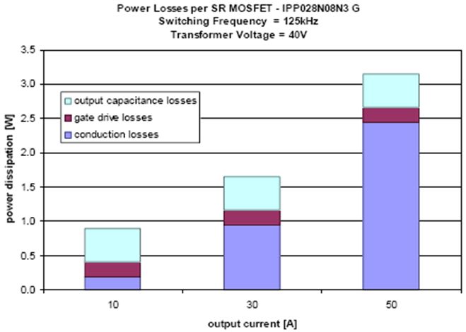 要優(yōu)化SR MOSFET的效率,必須找到開關(guān)損耗與導(dǎo)通損耗之間的最佳平衡點(diǎn)。在輕負(fù)載條件下,RDS(on)導(dǎo)通損耗占總功耗的比例極低。在這種情況下,在整個(gè)負(fù)載范圍內(nèi)基本保持不變的開關(guān)損耗是主要損耗。但是,當(dāng)輸出電流較高時(shí),導(dǎo)通損耗則成為最主要的損耗,其占總功耗的比例也最高,請(qǐng)參見圖2。