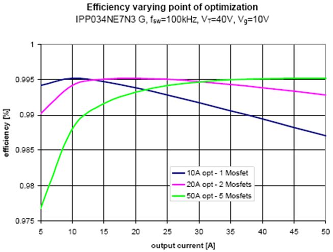 為闡明這個(gè)問題,圖4顯示了不同優(yōu)化方法得到的效率。圖中所示效率曲線為,當(dāng)變壓器電壓為40V、柵極驅(qū)動(dòng)電壓為10V、開關(guān)頻率為100kHz時(shí)計(jì)算得到的12V同步整流級(jí)的效率。在75V優(yōu)化表中選擇 IPP034NE7N3,按10 A MOSFET電流進(jìn)行設(shè)計(jì),所得到的優(yōu)化方案僅需一個(gè)MOSFET。如圖4所示,這種優(yōu)化方案能夠在低電流時(shí)實(shí)現(xiàn)很高的效率,而在高電流時(shí)效率卻極低。按50 A進(jìn)行優(yōu)化設(shè)計(jì),所得到的最佳方案則需要5個(gè)MOSFET。采用這種優(yōu)化方案,低電流時(shí)的效率將低得不能接受,但在滿負(fù)載時(shí)可以達(dá)到最高效率。因此,對(duì)該設(shè)置而言,最佳優(yōu)化方案是采用兩個(gè)并聯(lián)的MOSFET,從而獲得整體均衡的效率。