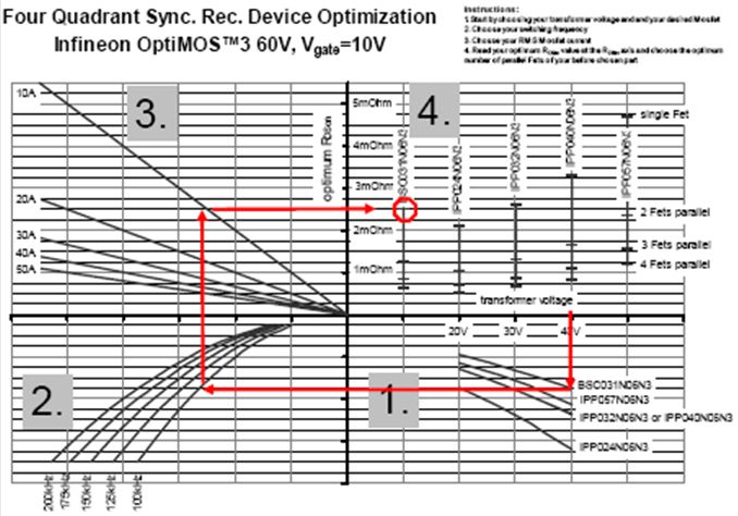 為了幫助開發(fā)人員更輕松地為SR應(yīng)用選擇最優(yōu)MOSFET,下面介紹一個(gè)四象限SR器件優(yōu)化表。借助這個(gè)優(yōu)化表,可以根據(jù)三個(gè)應(yīng)用參數(shù)找到最適合的器件:次級(jí)變壓器電壓、開關(guān)頻率和RMS MOSFET電流。為便于理解,圖5給出了一個(gè)實(shí)際的例子。