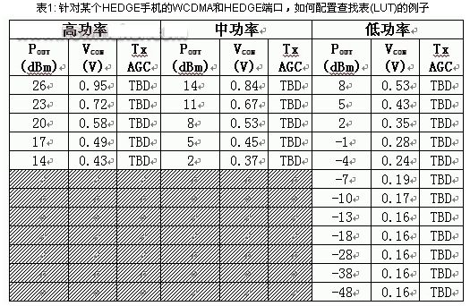 表1所示為針對某個HEDGE手機的WCDMA和HEDGE端口,如何配置查找表(LUT)的例子。該表格針對Avago的3G功率放大器,分為高、中和低功率模式三個主要部分。其它功率放大器因結(jié)構(gòu)不同而具有不同的設(shè)置。高、中和低功率模式分區(qū)下各列內(nèi)容為該模式下的輸出功率及其相應的VCON 電壓,這些電壓是基帶處理器生成的電壓,通知FAN5904為功率放大器提供正確的輸出電壓,獲得特定的輸出功率。GSM和EDGE則需要不同的查找表。
