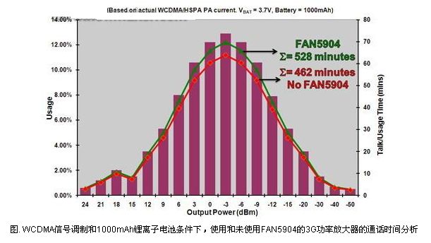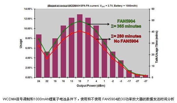 圖1和圖2顯示了在不同輸出功率條件下一個3G PA分別在語音和數(shù)據(jù)傳輸模式下有、無FAN5904時所使用的工作時間的分析。在PA電源電壓設(shè)定在鄰近信道功率比(ACPR)為-39dBc時的值時, WCDMA的ACPR可以改善到-43dBc,但是電流消耗將會增加,導致效率降低。