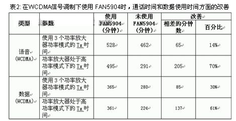 表2顯示了圖1和圖2的結(jié)果,以及功率放大器只工作于高功率模式下相應的分鐘數(shù)。在HSUPA、CDMA200 1x EV-DO和TD-SCDMA等不同信號調(diào)制模式下,電流消耗和通話時間都有類似的改善。這里把高功率模式工作的通話/數(shù)據(jù)使用時間一起顯示的原因是:新技術(shù)不僅得到了更多的分鐘數(shù),從設(shè)計角度來看,亦簡化了校準工作。當功率放大器具有多種功率模式時,固件必需適應何時從一個等級切換到下一個等級,因為在整個輸出功率范圍內(nèi),每個功率放大器的每種功率模式都存在獨特的VPA-POUT 曲線。由于現(xiàn)在大多數(shù)手機都支持至少三個頻段,這意味著滿足要求的系統(tǒng)中可能有三種3G功率放大器,所以增加了復雜程度。在處于一種功率模式的功率放大器中使用FAN5904,可以消除模式切換帶來的復雜性,更快地進行功率放大器校準,因為需要的校準點較少。這樣就縮短了測試/校準的時間,并且降低了制造成本,同時簡化了設(shè)計過程。
