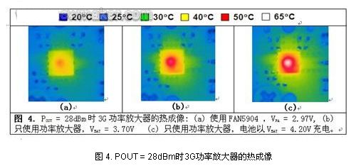 一個時常被忽視,但經(jīng)常遭到抱怨的參數(shù)是耗熱問題。在手持電話貼近頭部進行通話,使用手機網(wǎng)上沖浪或者玩在線網(wǎng)絡(luò)游戲時手機發(fā)熱,大多數(shù)用戶會因此而感到煩惱。問題的關(guān)鍵在于,設(shè)計人員在設(shè)計手機時必需將這一因素考慮在內(nèi)。圖4所示為某3G功率放大器的熱成像,其中,(a)為使用FAN5904來供電;(b)為直接與電池連接;(c)為電池以4.2V電壓充電。使用FAN5904時,在滿輸出功率情況下,功率放大器的溫度幾乎不可能達到50?C,在(b)和(c)的情況下,溫度很容易達到50?C和65?C,使用一段時間后,手機會很快發(fā)熱。在數(shù)據(jù)卡應用中,尤其是3G USB調(diào)制解調(diào)器卡開始流行,熱耗散,或者說實現(xiàn)熱耗散最小化變得十分重要。USB卡不能像手機那樣有效地散熱,因為它的體積非常小。由于3G調(diào)制解調(diào)器主要用于數(shù)據(jù),功率放大器在大部分時間運行于“發(fā)熱”狀態(tài)。減少這種熱量的最有效方式是使用諸如FAN5904的降壓轉(zhuǎn)換器。
