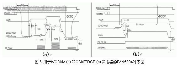 在輸出功率需要從低水平變到高水平,或者從啟動開始,瞬態(tài)響應時間為10?s。對于降壓穩(wěn)壓器而言,關(guān)鍵是使功率放大器滿足這些規(guī)范要求,避免出現(xiàn)通話中斷或者通話語音質(zhì)量不良的情況。由于用戶在不同的區(qū)域移動,信號覆蓋情況或好或壞,雖然如此,通話中斷現(xiàn)象是用戶所不能容忍的。對于GSM/EDGE模式,F(xiàn)AN5904能夠在5?s內(nèi)完成電壓之間的跳變,滿足GSM規(guī)范。圖6所示為用于WCDMA和GSM /EDGE發(fā)送器的FAN5904時序圖。