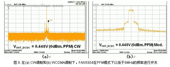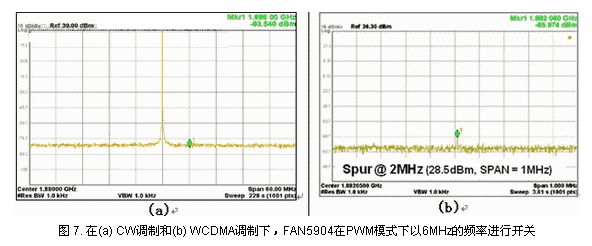在使用降壓轉(zhuǎn)換器時,我們關(guān)心的是開關(guān)頻率如何影響RF性能,RF工程師極不愿意添加一個會對RF信號保真度(發(fā)送和接收兩個方面)造成潛在影響的器件。如前所述,F(xiàn)AN5904采用PWM或PFM模式工作,分析顯示,兩者均不會對RF性能造成影響。圖7(a)所示為28.5dBm信號的發(fā)送CW(關(guān)閉調(diào)制以顯示接近中心的尖刺),以及距右側(cè)6MHz的標記1。FAN5904產(chǎn)生的假性音調(diào)(spurious tones)水平很低,使得尖刺低于噪聲本底。圖7(b)所示為開啟調(diào)制時的尖刺水平。這種尖刺很小,遠遠低于Tx遮蔽水平。FAN5904具有6MHz 開關(guān)頻率的一個優(yōu)勢在于該頻率遠離信號頻率,并且位于5MHz的帶寬之外,轉(zhuǎn)換成位于WCDMA信號兩側(cè)的2.5MHz頻率。