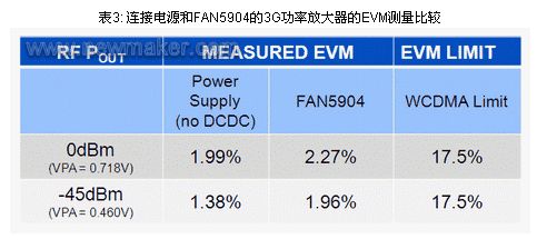 表3列出了所測量的0dBm 和-45dBm (圖8中VPA 值接近VOUT_DCDC )輸出功率的EVM,比較使用電源和FAN5904為3G功率放大器供電的情況。兩列數(shù)值之間的差異很小,這清楚表明信號保真度的變化不大,不會影響RF 性能,遠在WCDMA極限數(shù)值之下。