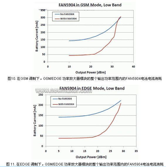 最后一個重要特性是,F(xiàn)AN5904控制GSM/EDGE功率放大器模塊的能力在于將RF功率管理解決方案從 FAN5904分離出來。在GSM/EDGE模式下,F(xiàn)AN5904具有3A的設(shè)計峰值極限電流,因而能夠控制電流高達2A的功率放大器模塊。在GSM /EDGE模式下,由于電流負載更大,F(xiàn)AN5904總是以PWM方式工作,因為GSM和EDGE信號較3G信號具有更高的輸出功率水平,因此它以 3MHz的頻率進行開關(guān)。3MHz是合適的開關(guān)頻率,因為它位于WCDMA通道帶寬之外,但是仍然可以使用小電感和小電容來處理更大電流負載,并使效率維持在高達95%的水平。人們可能要問,為什么在該模式下不使用6MHz,這在設(shè)計上是不可行的,因為較大的電流負載會使開關(guān)損耗更高,小型化解決方案帶來的好處在效率方面得不到補償。圖10和圖11顯示,在蜂窩設(shè)備處于GSM或EDGE模式下,使用FAN5904可將電流降低100mA。