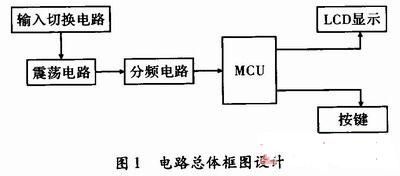 如圖1所示。框圖包括輸入切換部分、振蕩部分、分頻部分、單片機部分、顯示部分和鍵盤部分。此系統(tǒng)由STC89C51單片機作為控制核心,輸入切換部分采用雙刀雙擲繼電器完成待測電容或電感的線路切換,振蕩電路工作在放大諧振狀態(tài),頻率有高頻管9018的集電極輸出,由于頻率較高,所以需經(jīng)過信號分頻,再者由于輸出的電壓幅度大,此處無需再加一級驅(qū)動,以74LS393數(shù)字分頻芯片,把分頻端級聯(lián)實現(xiàn)100分頻,最終信號進入單片機,由單片機計算出頻率,經(jīng)過算法設(shè)計,實現(xiàn)未知電容或電感參數(shù)的測定。圖1給出了系統(tǒng)的總體框架圖。
