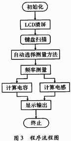 系統(tǒng)上電初始化并且清屏,單片機初始化完成后,進入鍵盤掃描程序,當要進行電容或電感測量時,選擇測量按鍵,系統(tǒng)進行自動判斷并進行電容或電感的測量。當判斷為電容時,系統(tǒng)選擇電容的計算方法。當判斷為電感時,系統(tǒng)選擇電感的計算方法。計算完成后在液晶屏上顯示測量結(jié)果。下面是具體的程序流程圖,如圖3所示。