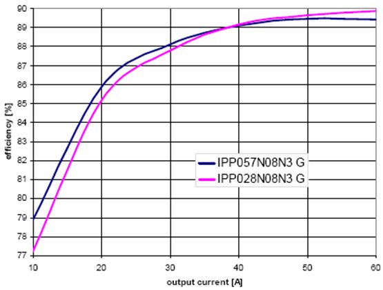 圖8表明了在實際應(yīng)用中,不同MOSFET RDS(on) 值范圍的影響。圖中所示為在服務(wù)器電源中分別測得的IPP028N08N3 G和IPP057N08N3 G的值。