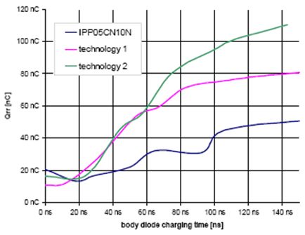 對于優(yōu)化能效,MOSFET內(nèi)部的體二極管具有關(guān)鍵作用。在每個開關(guān)循環(huán)中,在MOSFET被關(guān)斷之前,體二極管通常會通電,反向恢復(fù)電荷Qrr*也由此積聚起來。在第3節(jié)中已經(jīng)提到,數(shù)據(jù)手冊中所載Qrr與實際Qrr*有所出入。數(shù)據(jù)手冊中的值是按di/dt為100 A/μs測得的,二極管被施以最高漏極電流,并且MOSFET關(guān)斷前的導(dǎo)通時間長達500 μs左右甚至更長。因此,所測得的值是盡可能最高的Qrr*。此外,JEDEC標準所規(guī)定的測定方法不僅包含了Qrr*,而且包含MOSFET的部分輸出電荷,因而得到的總值很高,與實際值不相符。需要強調(diào)的是,雖然在實際應(yīng)用中,di/dt可能高達1000 A/μs,并且di/dt越高,Qrr*也越高。但是,Qrr*主要取決于電流和二極管導(dǎo)通時間。由于在實際應(yīng)用中,電流僅為最高漏極電流的一半甚或更低,并且二極管導(dǎo)通時間僅為50 ns至150 ns,因此實際Qrr*值比數(shù)據(jù)手冊中的值低得多。