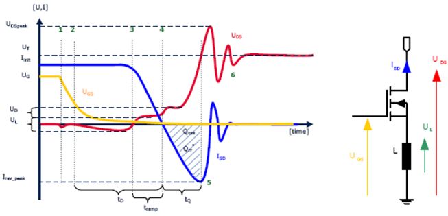 分析首先從開關(guān)的導(dǎo)通狀態(tài)開始:此時,柵極電壓很高,漏源電壓幾乎為零,電流從源極流向漏極。在點1時,柵極被關(guān)斷。在UDS波形中,這表現(xiàn)為柵極電容CG放電產(chǎn)生的負電壓驟降很小。此放電會在MOSFET的源極連接處產(chǎn)生具有大的電流變化(di/dt)的電流峰值。在感應(yīng)作用下,源極的這種電感會引起UDS波形發(fā)生壓降。